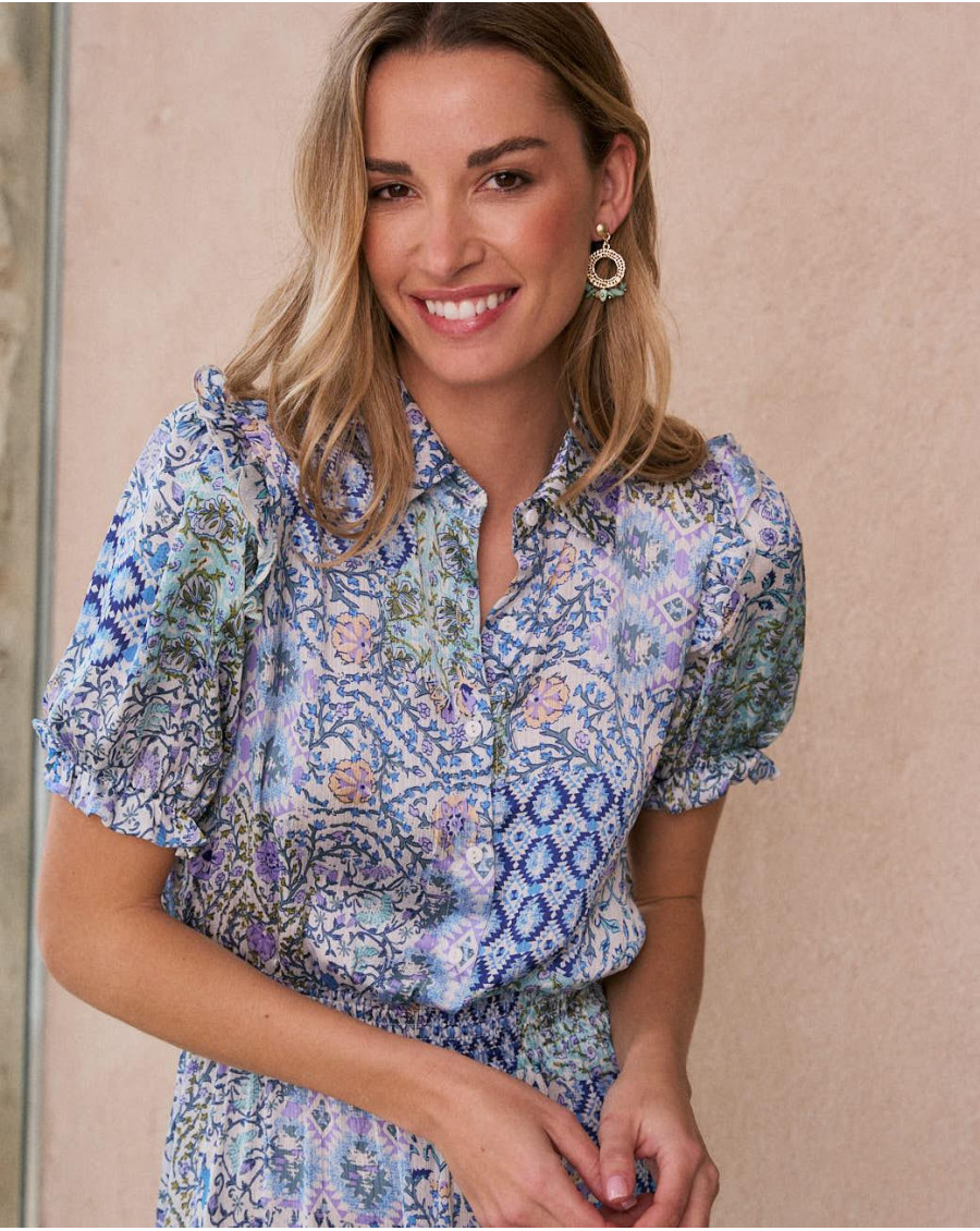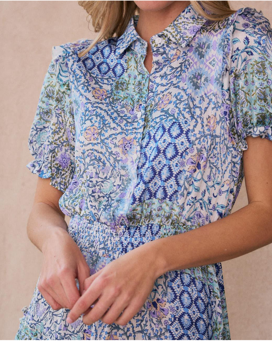 Robe courte avec imprimer dans les tons roses, idéale pour un look frais et féminin. Modèle à manches courtes avec col chemise et boutonnage sur le devant. La jupe à volants ajoute du mouvement et une touche romantique, parfaite pour les journées d’été.