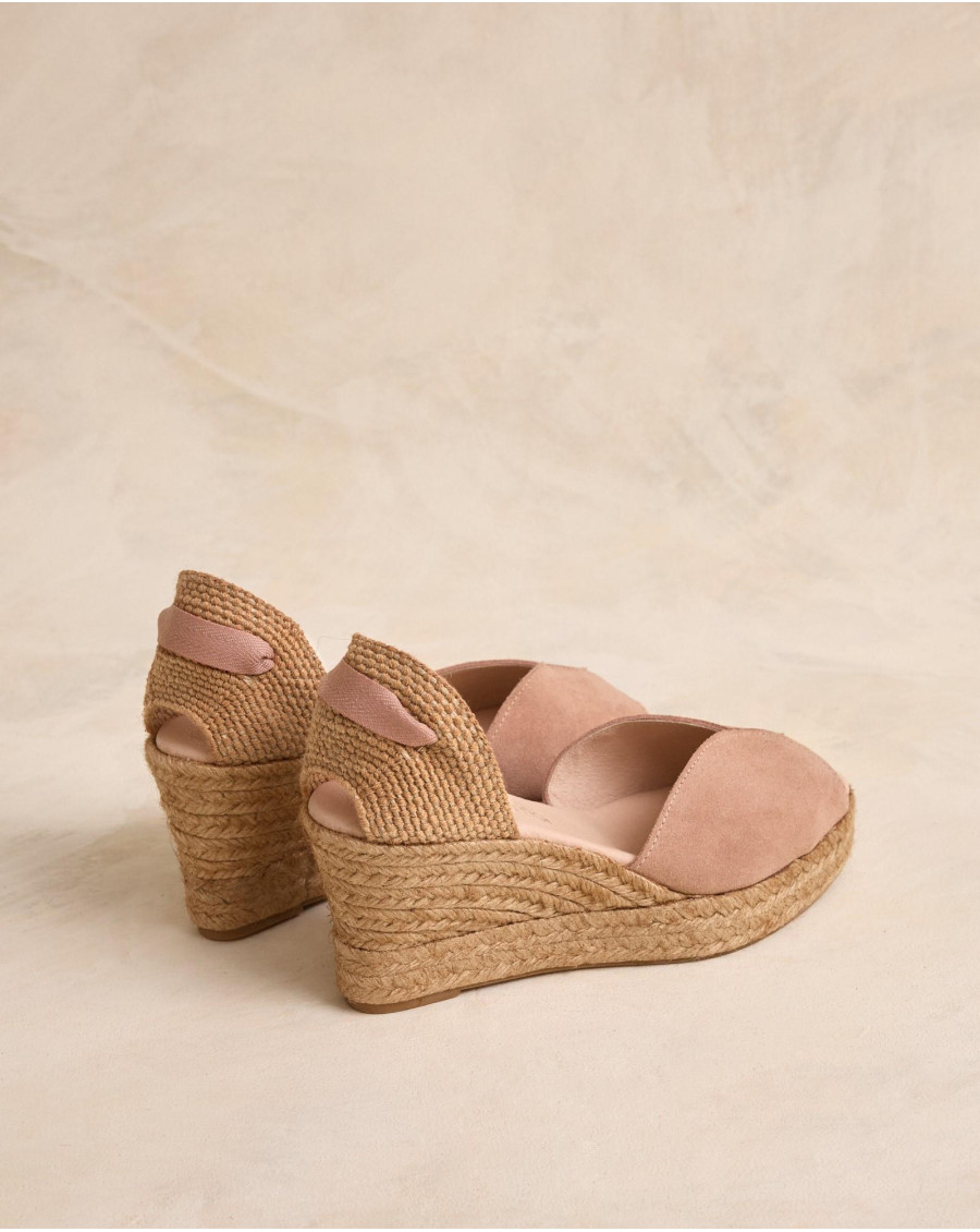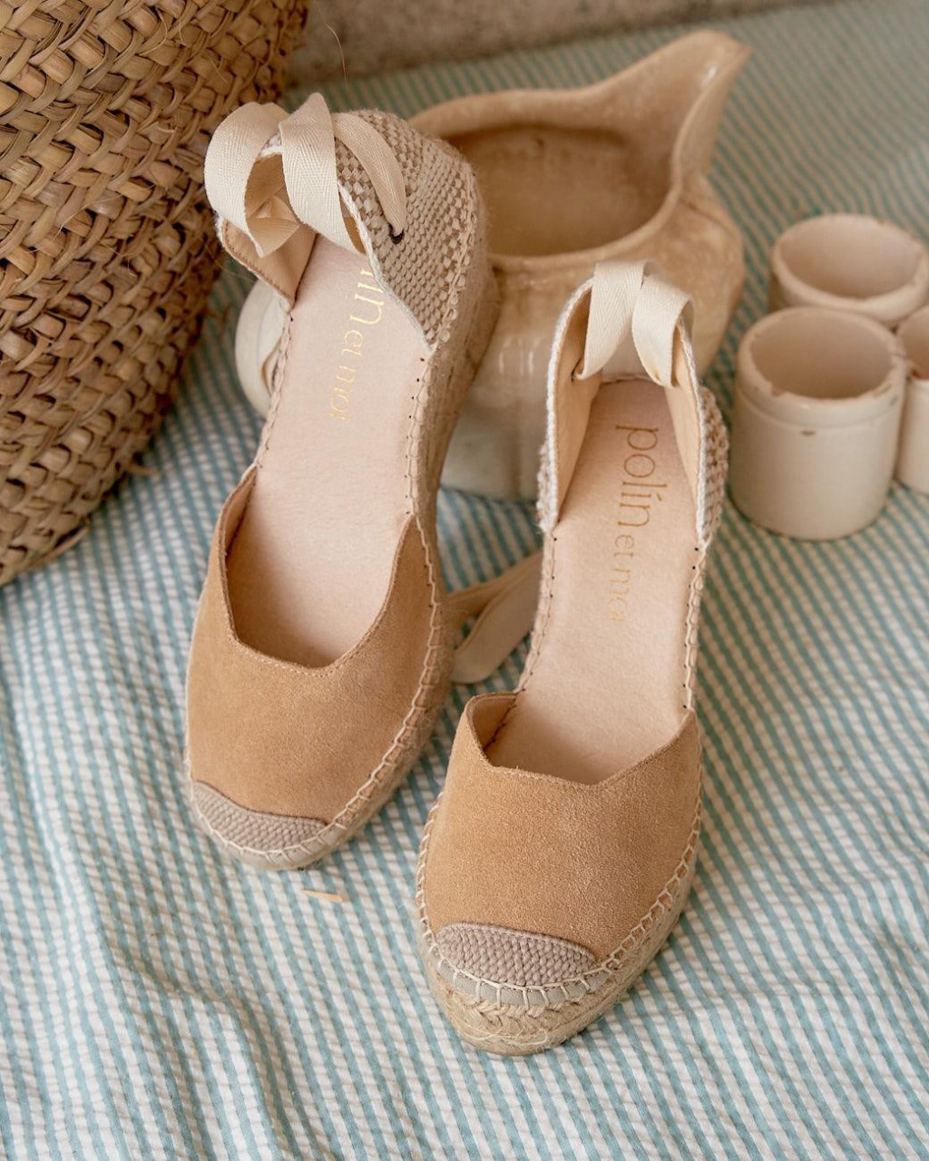 Espadrillas con zeppa in camoscio color cammello. Punta leggermente appuntita. Scollo aperto con design quadrato. Cinturini di colore grezzo da annodare comodamente intorno alla caviglia. Fabbricazione spagnola di iuta naturale. La soletta è dotata di un cuscinetto per un maggiore comfort. Un'espadrillas originale che puoi abbinare ai tuoi look preferiti in questa stagione. Progettato e prodotto in Spagna.