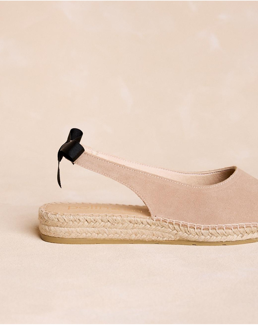 Espadrillas piatte in camoscio nero. Punta leggermente appuntita. Scollo arrotondato. Design senza schienale con dettaglio fiocco in colore tortora. Produzione spagnola di iuta naturale. La soletta ha un cuscinetto per un maggiore comfort. Un'espadrillas comoda e femminile da indossare tutti i giorni.