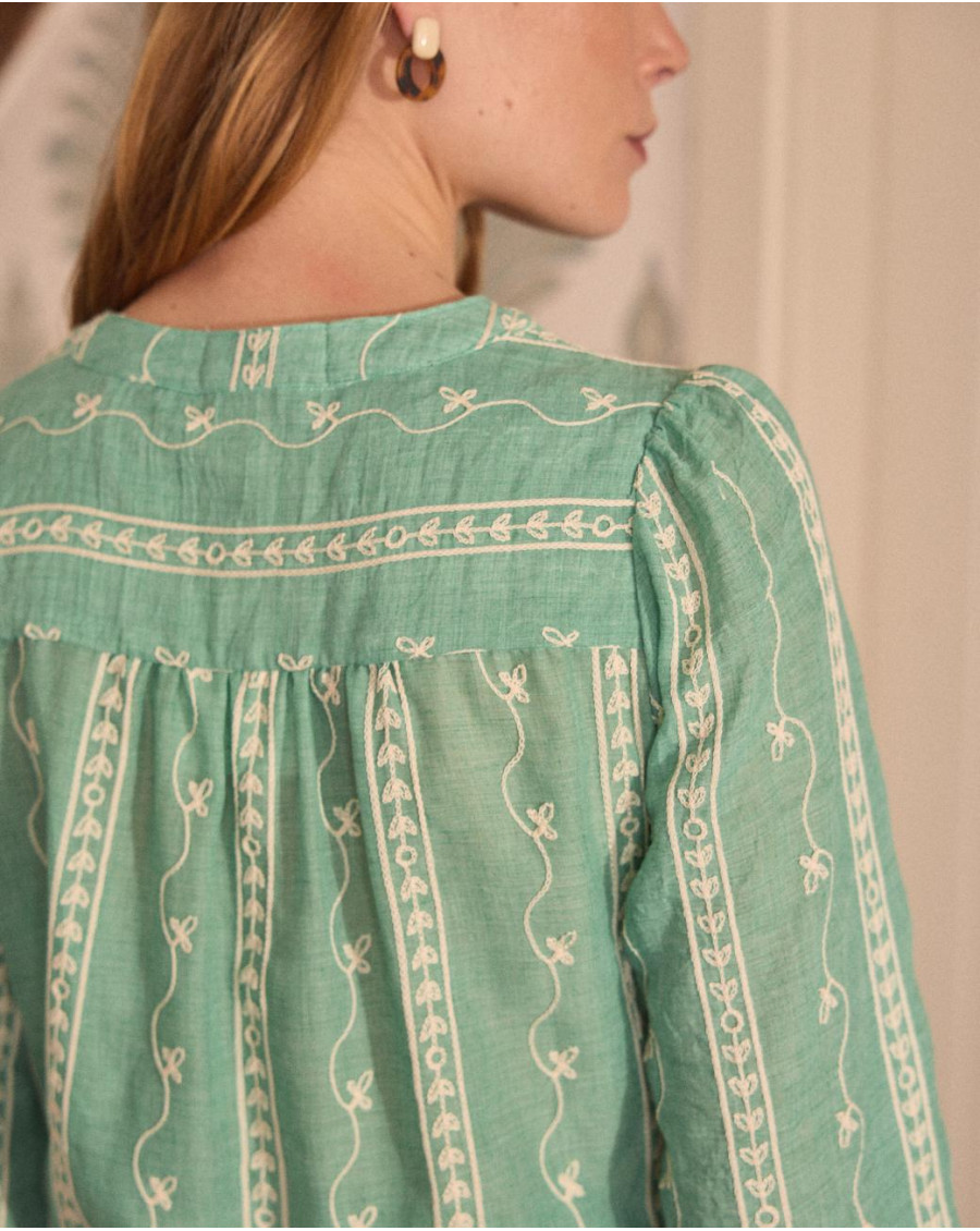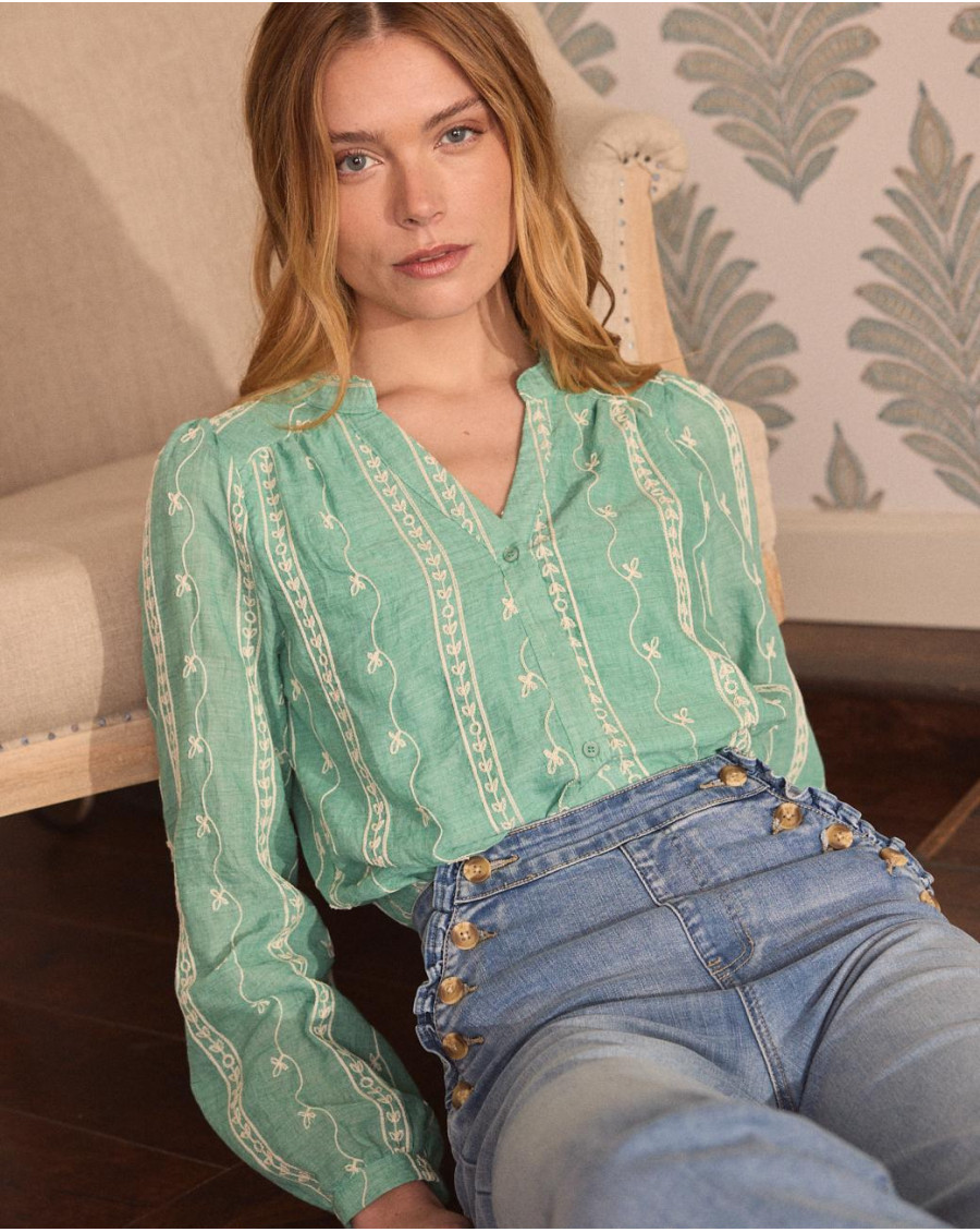 Blusa branca com bordado floral no peito, decote em V, mangas com folhos e botões na frente.